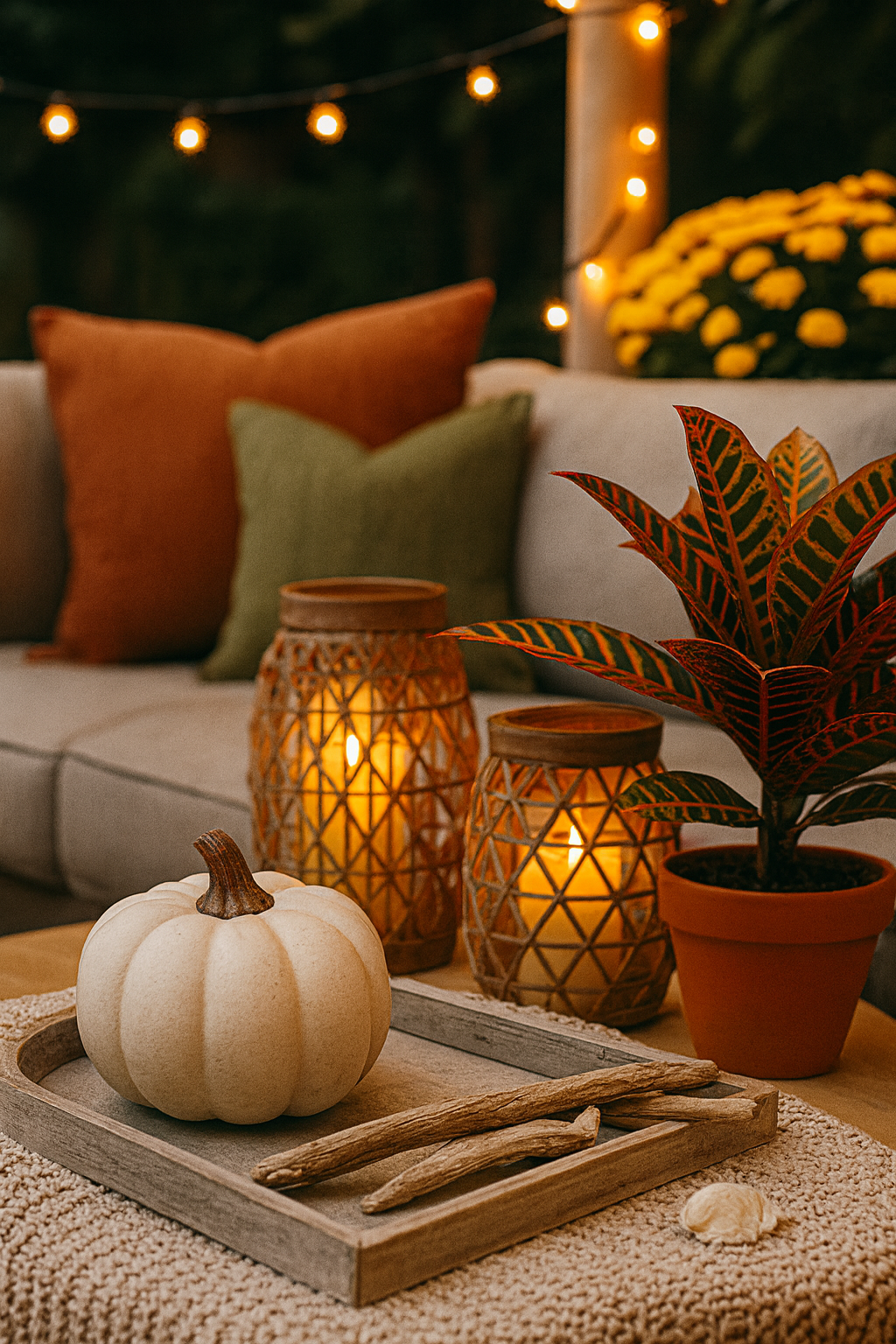 Reusable accents: Resin pumpkins, woven rattan lanterns, or metal candleholders last for years and withstand guest use.