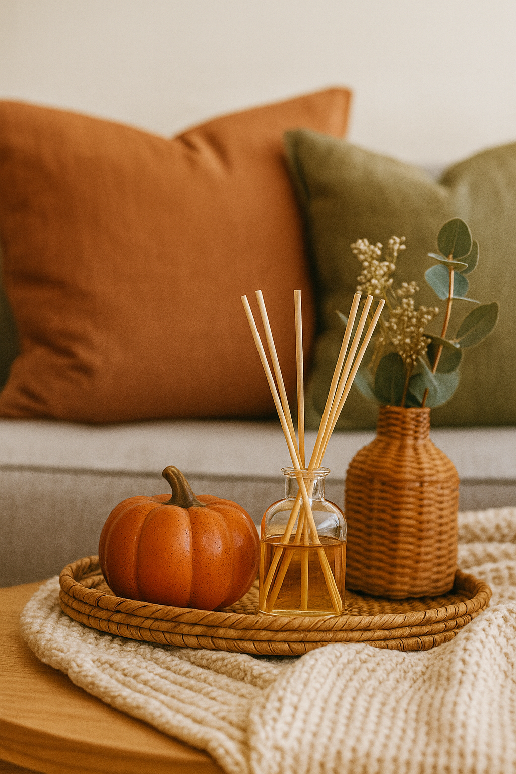 Curated vignettes: A tray with a ceramic pumpkin, reed diffuser, and faux eucalyptus looks styled but cleans easily.