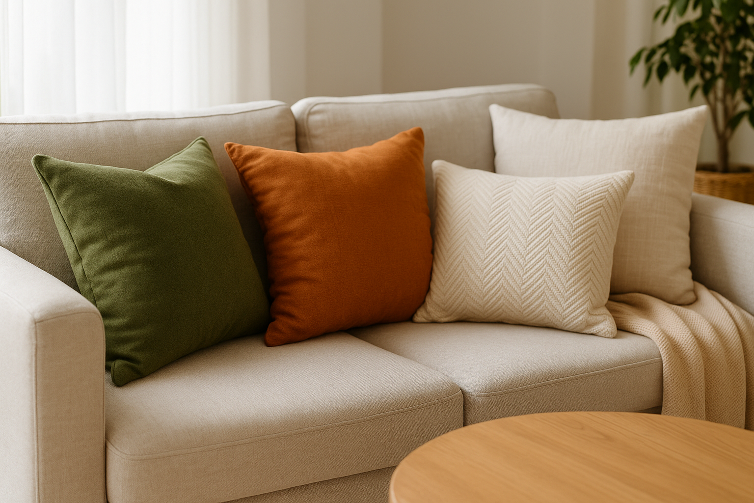 High-impact swaps: Two or three accent pillows in rust, olive, or marigold paired with a light knit throw.