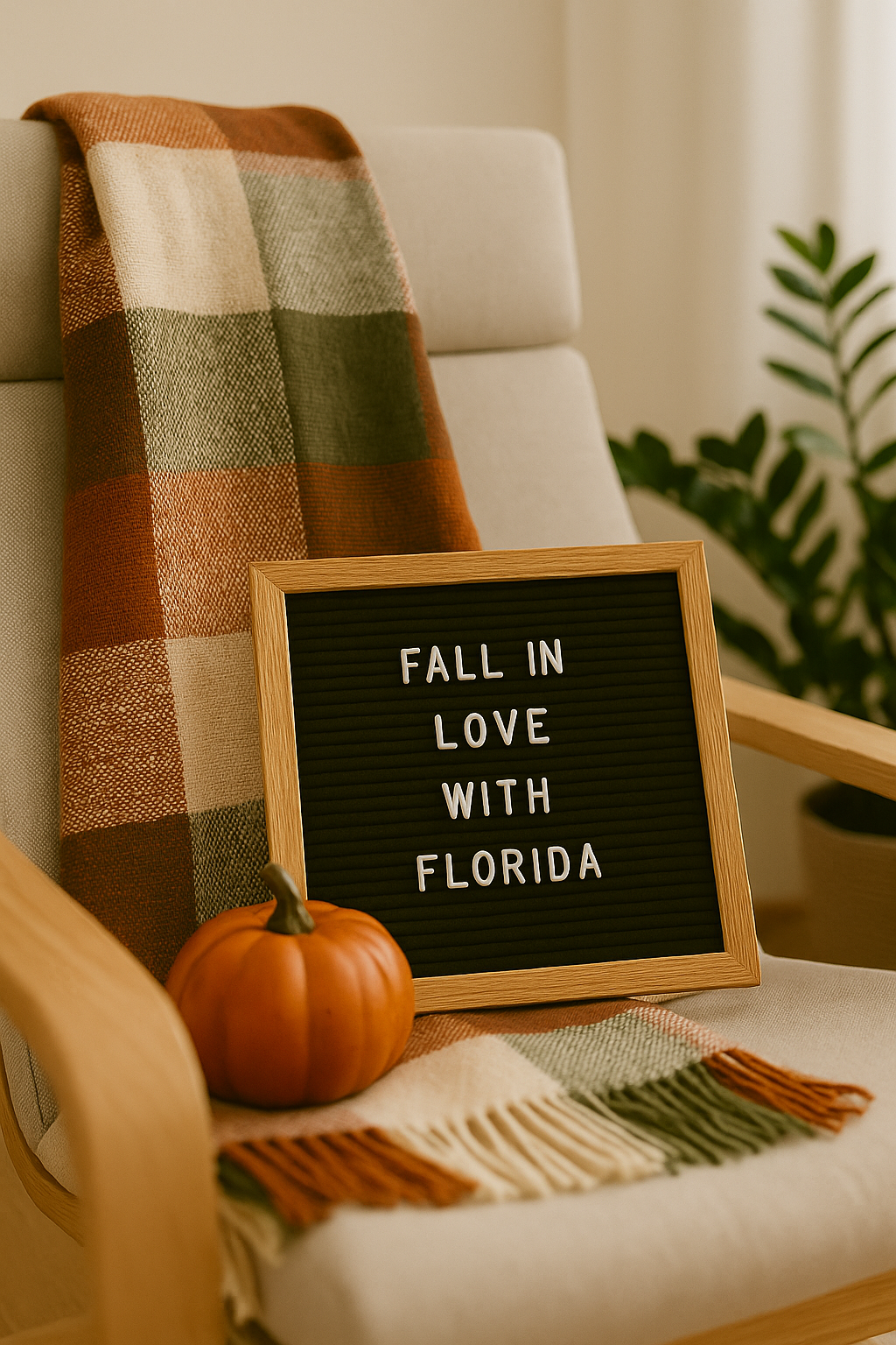 Instagram corner: A plaid throw on a chair, mini pumpkin, and letter board with “Fall in Love with Florida” creates a shareable backdrop.