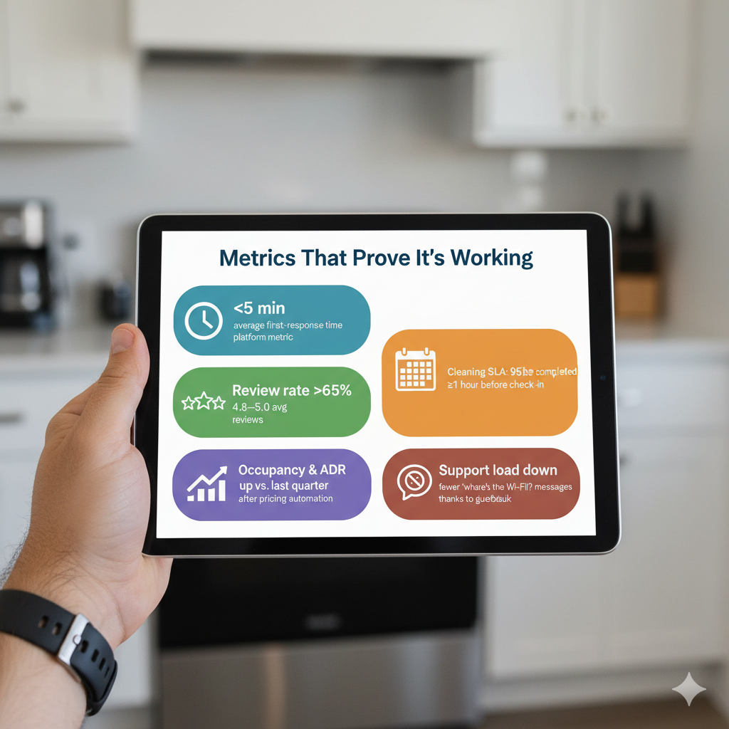 - Cleaning SLA: 95% jobs completed ≥1 hour before check-in.