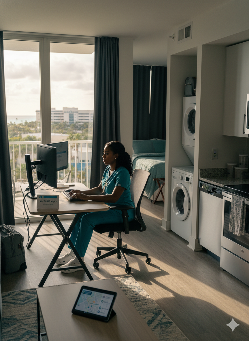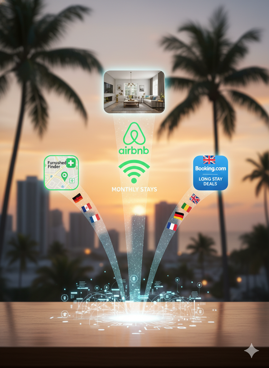 Where they book: Airbnb’s Monthly Stays filter, Furnished Finder (for healthcare pros), Booking.com’s Long Stays, and niche platforms like HouseStay or Blueground. These channels now dedicate sections specifically to 30- to 90-night rentals in South Florida.