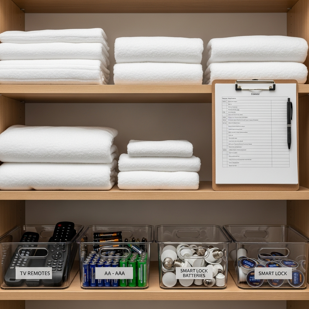 - Pull critical spares for common fail points: TV remotes, batteries, light bulbs, smart-lock batteries, coffee maker parts — and store them discreetly but accessibly.