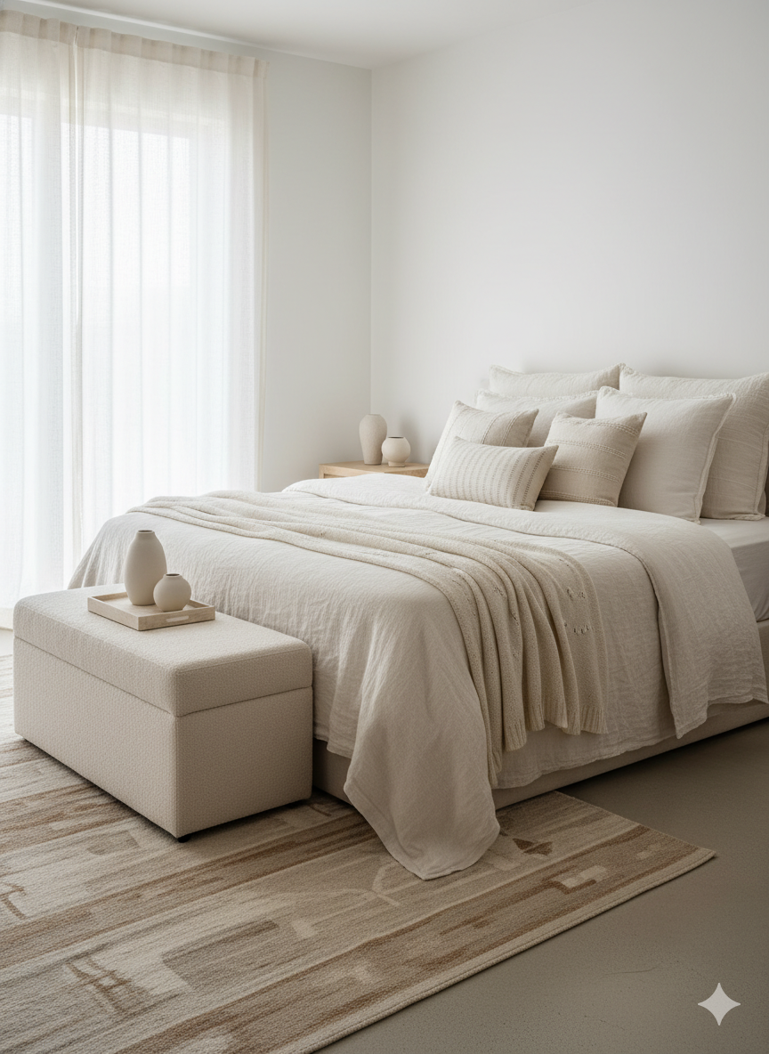 - Off-white duvet cover + crisp sheet set + textured throw at the foot