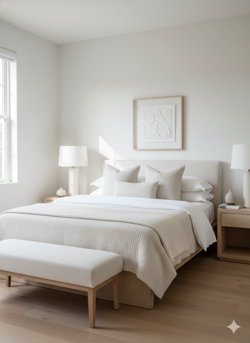 - Keep decor minimal but elevated: one textured art piece, one clean bedside vignette