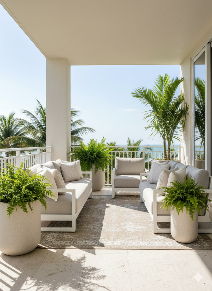 - Light stone-toned planters + greenery = instant upscale coastal vibe